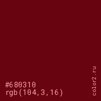 Цвет #680310 в цветовой модели RGB обозначается тремя октетами (104, 3, 16) в десятичном формате и #680310 в шестнадцатиричном (hex) формате, которые являются интенсивностью красного 104 (hex 68), интенсивность зелёного 3 (hex 03) и интенсивность синего 16 (hex 10).