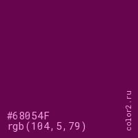 Цвет #68054F в цветовой модели RGB обозначается тремя октетами (104, 5, 79) в десятичном формате и #68054F в шестнадцатиричном (hex) формате, которые являются интенсивностью красного 104 (hex 68), интенсивность зелёного 5 (hex 05) и интенсивность синего 79 (hex 4F).