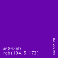 Цвет #6805AD в цветовой модели RGB обозначается тремя октетами (104, 5, 173) в десятичном формате и #6805AD в шестнадцатиричном (hex) формате, которые являются интенсивностью красного 104 (hex 68), интенсивность зелёного 5 (hex 05) и интенсивность синего 173 (hex AD).