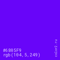 Цвет #6805F9 в цветовой модели RGB обозначается тремя октетами (104, 5, 249) в десятичном формате и #6805F9 в шестнадцатиричном (hex) формате, которые являются интенсивностью красного 104 (hex 68), интенсивность зелёного 5 (hex 05) и интенсивность синего 249 (hex F9).