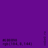 Цвет #680890 в цветовой модели RGB обозначается тремя октетами (104, 8, 144) в десятичном формате и #680890 в шестнадцатиричном (hex) формате, которые являются интенсивностью красного 104 (hex 68), интенсивность зелёного 8 (hex 08) и интенсивность синего 144 (hex 90).