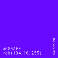 Цвет #680AFF в цветовой модели RGB обозначается тремя октетами (104, 10, 255) в десятичном формате и #680AFF в шестнадцатиричном (hex) формате, которые являются интенсивностью красного 104 (hex 68), интенсивность зелёного 10 (hex 0A) и интенсивность синего 255 (hex FF).