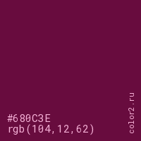 Цвет #680C3E в цветовой модели RGB обозначается тремя октетами (104, 12, 62) в десятичном формате и #680C3E в шестнадцатиричном (hex) формате, которые являются интенсивностью красного 104 (hex 68), интенсивность зелёного 12 (hex 0C) и интенсивность синего 62 (hex 3E).