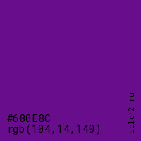 Цвет #680E8C в цветовой модели RGB обозначается тремя октетами (104, 14, 140) в десятичном формате и #680E8C в шестнадцатиричном (hex) формате, которые являются интенсивностью красного 104 (hex 68), интенсивность зелёного 14 (hex 0E) и интенсивность синего 140 (hex 8C).