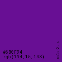 Цвет #680F94 в цветовой модели RGB обозначается тремя октетами (104, 15, 148) в десятичном формате и #680F94 в шестнадцатиричном (hex) формате, которые являются интенсивностью красного 104 (hex 68), интенсивность зелёного 15 (hex 0F) и интенсивность синего 148 (hex 94).
