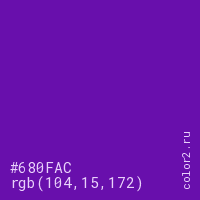 Цвет #680FAC в цветовой модели RGB обозначается тремя октетами (104, 15, 172) в десятичном формате и #680FAC в шестнадцатиричном (hex) формате, которые являются интенсивностью красного 104 (hex 68), интенсивность зелёного 15 (hex 0F) и интенсивность синего 172 (hex AC).