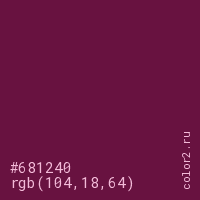Цвет #681240 в цветовой модели RGB обозначается тремя октетами (104, 18, 64) в десятичном формате и #681240 в шестнадцатиричном (hex) формате, которые являются интенсивностью красного 104 (hex 68), интенсивность зелёного 18 (hex 12) и интенсивность синего 64 (hex 40).