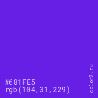 Цвет #681FE5 в цветовой модели RGB обозначается тремя октетами (104, 31, 229) в десятичном формате и #681FE5 в шестнадцатиричном (hex) формате, которые являются интенсивностью красного 104 (hex 68), интенсивность зелёного 31 (hex 1F) и интенсивность синего 229 (hex E5).