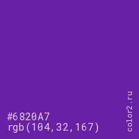 Цвет #6820A7 в цветовой модели RGB обозначается тремя октетами (104, 32, 167) в десятичном формате и #6820A7 в шестнадцатиричном (hex) формате, которые являются интенсивностью красного 104 (hex 68), интенсивность зелёного 32 (hex 20) и интенсивность синего 167 (hex A7).