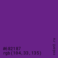 Цвет #682187 в цветовой модели RGB обозначается тремя октетами (104, 33, 135) в десятичном формате и #682187 в шестнадцатиричном (hex) формате, которые являются интенсивностью красного 104 (hex 68), интенсивность зелёного 33 (hex 21) и интенсивность синего 135 (hex 87).