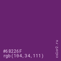 Цвет #68226F в цветовой модели RGB обозначается тремя октетами (104, 34, 111) в десятичном формате и #68226F в шестнадцатиричном (hex) формате, которые являются интенсивностью красного 104 (hex 68), интенсивность зелёного 34 (hex 22) и интенсивность синего 111 (hex 6F).
