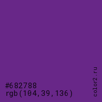 Цвет #682788 в цветовой модели RGB обозначается тремя октетами (104, 39, 136) в десятичном формате и #682788 в шестнадцатиричном (hex) формате, которые являются интенсивностью красного 104 (hex 68), интенсивность зелёного 39 (hex 27) и интенсивность синего 136 (hex 88).