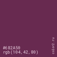 Цвет #682A50 в цветовой модели RGB обозначается тремя октетами (104, 42, 80) в десятичном формате и #682A50 в шестнадцатиричном (hex) формате, которые являются интенсивностью красного 104 (hex 68), интенсивность зелёного 42 (hex 2A) и интенсивность синего 80 (hex 50).