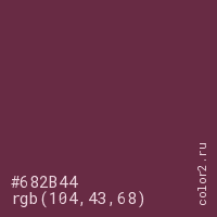 Цвет #682B44 в цветовой модели RGB обозначается тремя октетами (104, 43, 68) в десятичном формате и #682B44 в шестнадцатиричном (hex) формате, которые являются интенсивностью красного 104 (hex 68), интенсивность зелёного 43 (hex 2B) и интенсивность синего 68 (hex 44).