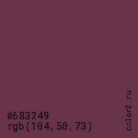Цвет #683249 в цветовой модели RGB обозначается тремя октетами (104, 50, 73) в десятичном формате и #683249 в шестнадцатиричном (hex) формате, которые являются интенсивностью красного 104 (hex 68), интенсивность зелёного 50 (hex 32) и интенсивность синего 73 (hex 49).