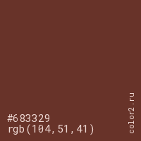 Цвет #683329 в цветовой модели RGB обозначается тремя октетами (104, 51, 41) в десятичном формате и #683329 в шестнадцатиричном (hex) формате, которые являются интенсивностью красного 104 (hex 68), интенсивность зелёного 51 (hex 33) и интенсивность синего 41 (hex 29).