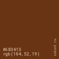 Цвет #683413 в цветовой модели RGB обозначается тремя октетами (104, 52, 19) в десятичном формате и #683413 в шестнадцатиричном (hex) формате, которые являются интенсивностью красного 104 (hex 68), интенсивность зелёного 52 (hex 34) и интенсивность синего 19 (hex 13).