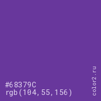 Цвет #68379C в цветовой модели RGB обозначается тремя октетами (104, 55, 156) в десятичном формате и #68379C в шестнадцатиричном (hex) формате, которые являются интенсивностью красного 104 (hex 68), интенсивность зелёного 55 (hex 37) и интенсивность синего 156 (hex 9C).