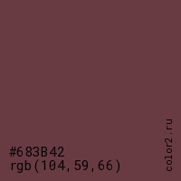 Цвет #683B42 в цветовой модели RGB обозначается тремя октетами (104, 59, 66) в десятичном формате и #683B42 в шестнадцатиричном (hex) формате, которые являются интенсивностью красного 104 (hex 68), интенсивность зелёного 59 (hex 3B) и интенсивность синего 66 (hex 42).
