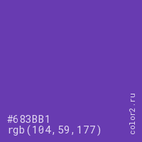 Цвет #683BB1 в цветовой модели RGB обозначается тремя октетами (104, 59, 177) в десятичном формате и #683BB1 в шестнадцатиричном (hex) формате, которые являются интенсивностью красного 104 (hex 68), интенсивность зелёного 59 (hex 3B) и интенсивность синего 177 (hex B1).