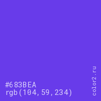 Цвет #683BEA в цветовой модели RGB обозначается тремя октетами (104, 59, 234) в десятичном формате и #683BEA в шестнадцатиричном (hex) формате, которые являются интенсивностью красного 104 (hex 68), интенсивность зелёного 59 (hex 3B) и интенсивность синего 234 (hex EA).