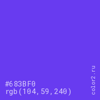 Цвет #683BF0 в цветовой модели RGB обозначается тремя октетами (104, 59, 240) в десятичном формате и #683BF0 в шестнадцатиричном (hex) формате, которые являются интенсивностью красного 104 (hex 68), интенсивность зелёного 59 (hex 3B) и интенсивность синего 240 (hex F0).