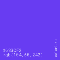 Цвет #683CF2 в цветовой модели RGB обозначается тремя октетами (104, 60, 242) в десятичном формате и #683CF2 в шестнадцатиричном (hex) формате, которые являются интенсивностью красного 104 (hex 68), интенсивность зелёного 60 (hex 3C) и интенсивность синего 242 (hex F2).
