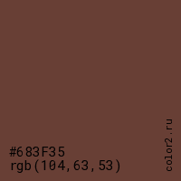 Цвет #683F35 в цветовой модели RGB обозначается тремя октетами (104, 63, 53) в десятичном формате и #683F35 в шестнадцатиричном (hex) формате, которые являются интенсивностью красного 104 (hex 68), интенсивность зелёного 63 (hex 3F) и интенсивность синего 53 (hex 35).