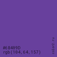 Цвет #68409D в цветовой модели RGB обозначается тремя октетами (104, 64, 157) в десятичном формате и #68409D в шестнадцатиричном (hex) формате, которые являются интенсивностью красного 104 (hex 68), интенсивность зелёного 64 (hex 40) и интенсивность синего 157 (hex 9D).