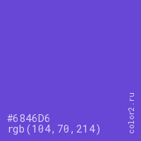 Цвет #6846D6 в цветовой модели RGB обозначается тремя октетами (104, 70, 214) в десятичном формате и #6846D6 в шестнадцатиричном (hex) формате, которые являются интенсивностью красного 104 (hex 68), интенсивность зелёного 70 (hex 46) и интенсивность синего 214 (hex D6).