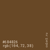 Цвет #684826 в цветовой модели RGB обозначается тремя октетами (104, 72, 38) в десятичном формате и #684826 в шестнадцатиричном (hex) формате, которые являются интенсивностью красного 104 (hex 68), интенсивность зелёного 72 (hex 48) и интенсивность синего 38 (hex 26).