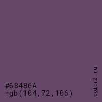 Цвет #68486A в цветовой модели RGB обозначается тремя октетами (104, 72, 106) в десятичном формате и #68486A в шестнадцатиричном (hex) формате, которые являются интенсивностью красного 104 (hex 68), интенсивность зелёного 72 (hex 48) и интенсивность синего 106 (hex 6A).