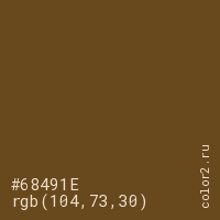 Цвет #68491E в цветовой модели RGB обозначается тремя октетами (104, 73, 30) в десятичном формате и #68491E в шестнадцатиричном (hex) формате, которые являются интенсивностью красного 104 (hex 68), интенсивность зелёного 73 (hex 49) и интенсивность синего 30 (hex 1E).