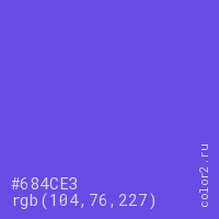 Цвет #684CE3 в цветовой модели RGB обозначается тремя октетами (104, 76, 227) в десятичном формате и #684CE3 в шестнадцатиричном (hex) формате, которые являются интенсивностью красного 104 (hex 68), интенсивность зелёного 76 (hex 4C) и интенсивность синего 227 (hex E3).