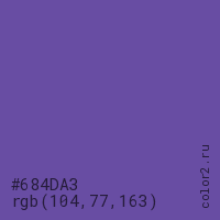 Цвет #684DA3 в цветовой модели RGB обозначается тремя октетами (104, 77, 163) в десятичном формате и #684DA3 в шестнадцатиричном (hex) формате, которые являются интенсивностью красного 104 (hex 68), интенсивность зелёного 77 (hex 4D) и интенсивность синего 163 (hex A3).