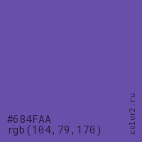 Цвет #684FAA в цветовой модели RGB обозначается тремя октетами (104, 79, 170) в десятичном формате и #684FAA в шестнадцатиричном (hex) формате, которые являются интенсивностью красного 104 (hex 68), интенсивность зелёного 79 (hex 4F) и интенсивность синего 170 (hex AA).