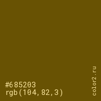 Цвет #685203 в цветовой модели RGB обозначается тремя октетами (104, 82, 3) в десятичном формате и #685203 в шестнадцатиричном (hex) формате, которые являются интенсивностью красного 104 (hex 68), интенсивность зелёного 82 (hex 52) и интенсивность синего 3 (hex 03).