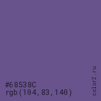 Цвет #68538C в цветовой модели RGB обозначается тремя октетами (104, 83, 140) в десятичном формате и #68538C в шестнадцатиричном (hex) формате, которые являются интенсивностью красного 104 (hex 68), интенсивность зелёного 83 (hex 53) и интенсивность синего 140 (hex 8C).