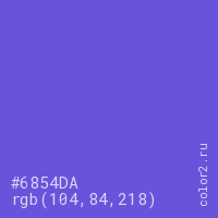 Цвет #6854DA в цветовой модели RGB обозначается тремя октетами (104, 84, 218) в десятичном формате и #6854DA в шестнадцатиричном (hex) формате, которые являются интенсивностью красного 104 (hex 68), интенсивность зелёного 84 (hex 54) и интенсивность синего 218 (hex DA).