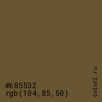 Цвет #685532 в цветовой модели RGB обозначается тремя октетами (104, 85, 50) в десятичном формате и #685532 в шестнадцатиричном (hex) формате, которые являются интенсивностью красного 104 (hex 68), интенсивность зелёного 85 (hex 55) и интенсивность синего 50 (hex 32).