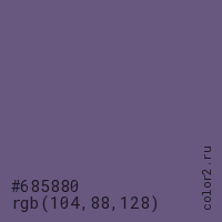 Цвет #685880 в цветовой модели RGB обозначается тремя октетами (104, 88, 128) в десятичном формате и #685880 в шестнадцатиричном (hex) формате, которые являются интенсивностью красного 104 (hex 68), интенсивность зелёного 88 (hex 58) и интенсивность синего 128 (hex 80).