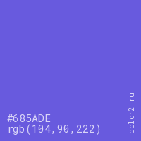 Цвет #685ADE в цветовой модели RGB обозначается тремя октетами (104, 90, 222) в десятичном формате и #685ADE в шестнадцатиричном (hex) формате, которые являются интенсивностью красного 104 (hex 68), интенсивность зелёного 90 (hex 5A) и интенсивность синего 222 (hex DE).