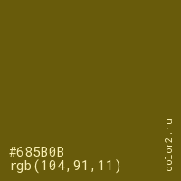 Цвет #685B0B в цветовой модели RGB обозначается тремя октетами (104, 91, 11) в десятичном формате и #685B0B в шестнадцатиричном (hex) формате, которые являются интенсивностью красного 104 (hex 68), интенсивность зелёного 91 (hex 5B) и интенсивность синего 11 (hex 0B).