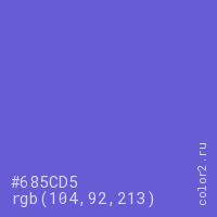 Цвет #685CD5 в цветовой модели RGB обозначается тремя октетами (104, 92, 213) в десятичном формате и #685CD5 в шестнадцатиричном (hex) формате, которые являются интенсивностью красного 104 (hex 68), интенсивность зелёного 92 (hex 5C) и интенсивность синего 213 (hex D5).