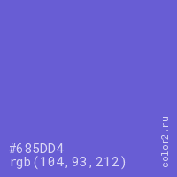 Цвет #685DD4 в цветовой модели RGB обозначается тремя октетами (104, 93, 212) в десятичном формате и #685DD4 в шестнадцатиричном (hex) формате, которые являются интенсивностью красного 104 (hex 68), интенсивность зелёного 93 (hex 5D) и интенсивность синего 212 (hex D4).
