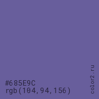 Цвет #685E9C в цветовой модели RGB обозначается тремя октетами (104, 94, 156) в десятичном формате и #685E9C в шестнадцатиричном (hex) формате, которые являются интенсивностью красного 104 (hex 68), интенсивность зелёного 94 (hex 5E) и интенсивность синего 156 (hex 9C).