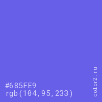 Цвет #685FE9 в цветовой модели RGB обозначается тремя октетами (104, 95, 233) в десятичном формате и #685FE9 в шестнадцатиричном (hex) формате, которые являются интенсивностью красного 104 (hex 68), интенсивность зелёного 95 (hex 5F) и интенсивность синего 233 (hex E9).