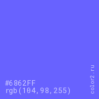 Цвет #6862FF в цветовой модели RGB обозначается тремя октетами (104, 98, 255) в десятичном формате и #6862FF в шестнадцатиричном (hex) формате, которые являются интенсивностью красного 104 (hex 68), интенсивность зелёного 98 (hex 62) и интенсивность синего 255 (hex FF).