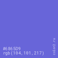 Цвет #6865D9 в цветовой модели RGB обозначается тремя октетами (104, 101, 217) в десятичном формате и #6865D9 в шестнадцатиричном (hex) формате, которые являются интенсивностью красного 104 (hex 68), интенсивность зелёного 101 (hex 65) и интенсивность синего 217 (hex D9).