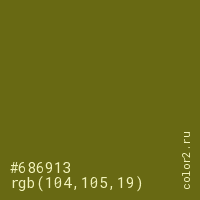 Цвет #686913 в цветовой модели RGB обозначается тремя октетами (104, 105, 19) в десятичном формате и #686913 в шестнадцатиричном (hex) формате, которые являются интенсивностью красного 104 (hex 68), интенсивность зелёного 105 (hex 69) и интенсивность синего 19 (hex 13).